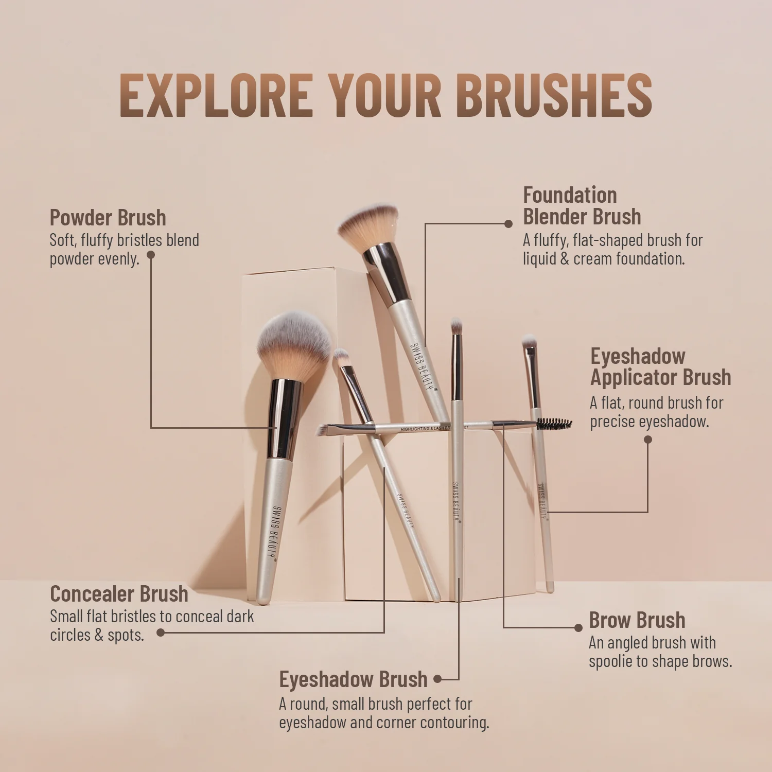 Swiss Beauty Professional Face & Eye Brush Set is the ultimate brush set for achieving flawless makeup looks every time. This set includes 6 brushes that cater to all your face and eye makeup application needs, from applying foundation to blending eyeshadows and highlighting your brows. The set includes-Concealer Brush, Powder Brush, Brow Brush, Eyeshadow Applicator Brush, Eyeshadow Brush and Foundation Blender Brush.