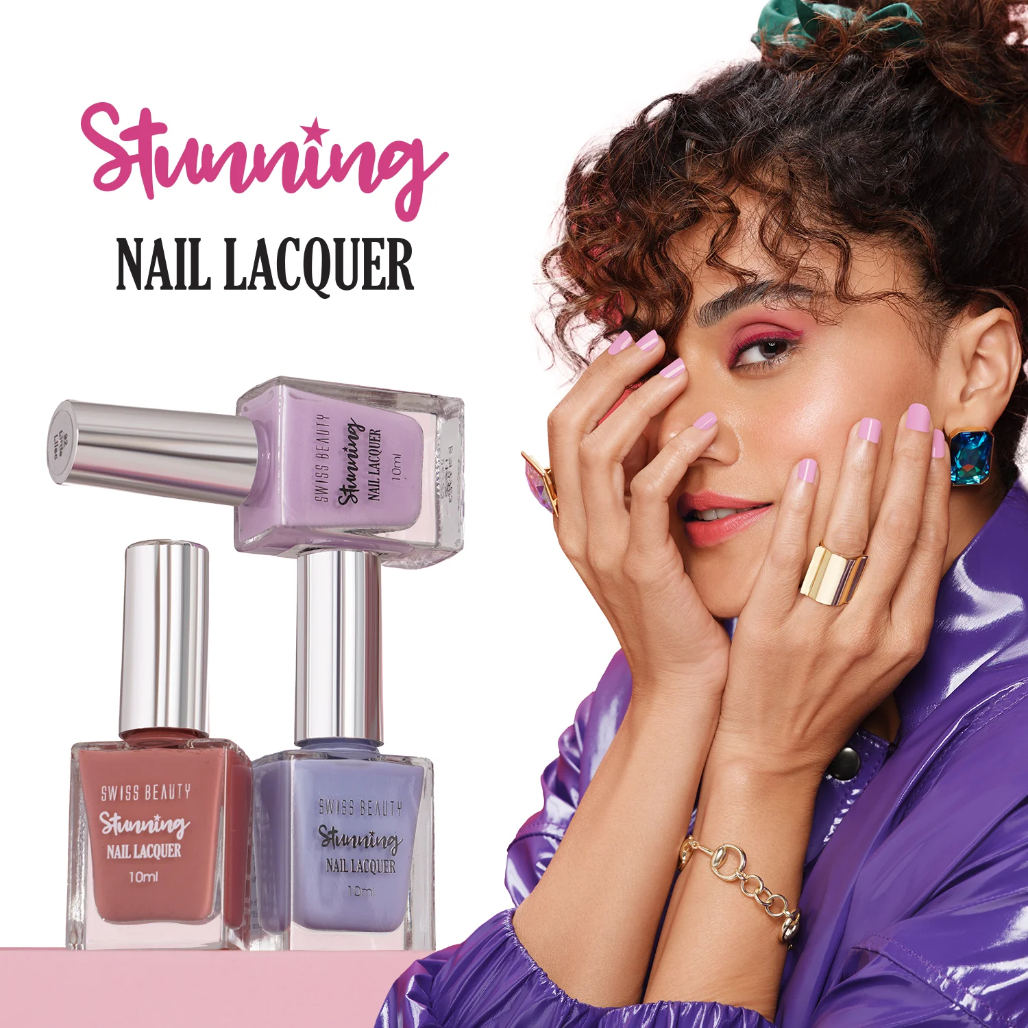 Introducing Swiss Beauty Stunning Nail Lacquer, a perfect nail paint collection to achieve glossy nails. The highly pigmented and high-quality formula delivers an exquisite, glossy finish with every stroke, ensuring a smooth application and a long-lasting stay.